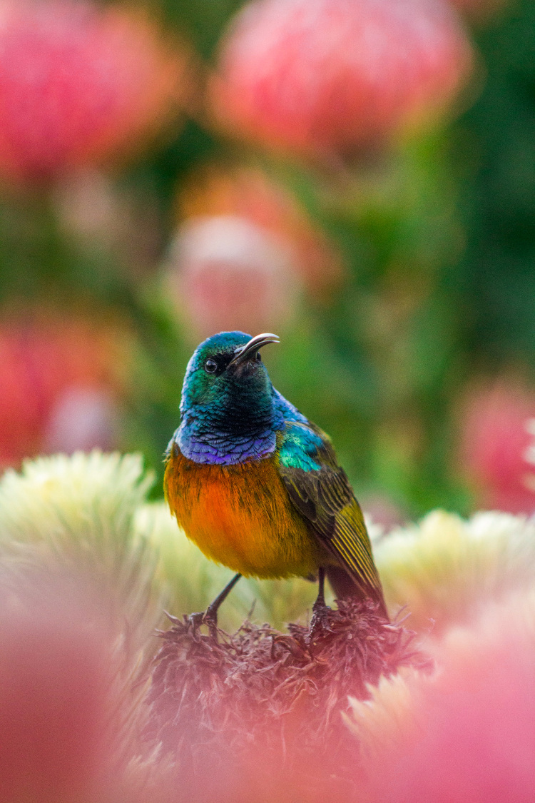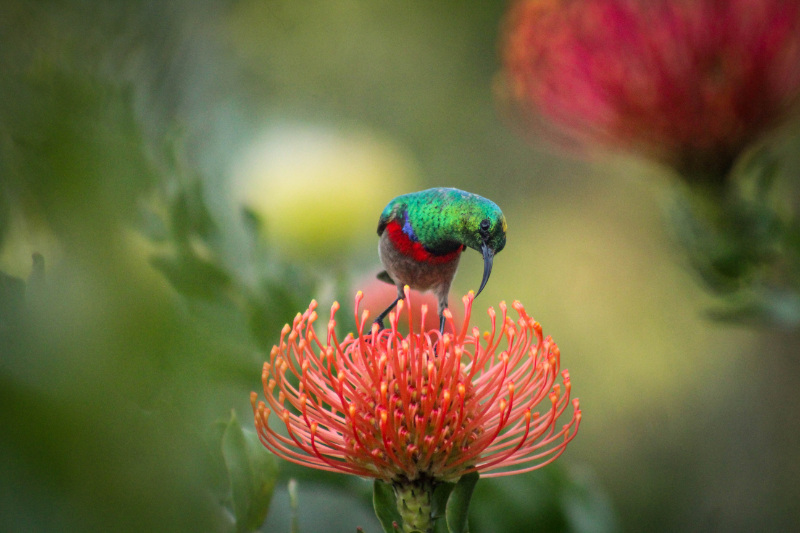 But the real stars of the show in the fynbos garden have to be the birds. The vibrant Erica species are the favourite, but by no means the only, food source for the spectacular orange-breasted sunbird, one of my favourite to encounter in the gardens. In the middle of the year, these birds disappear largely into the mountains to nest, but in the first few months of the year, when the ericas are in full bloom, and from August/September when most of the pincushions start to flower, they arrive in force, often chasing off the smaller double-collared sunbirds away from their preferred spots.