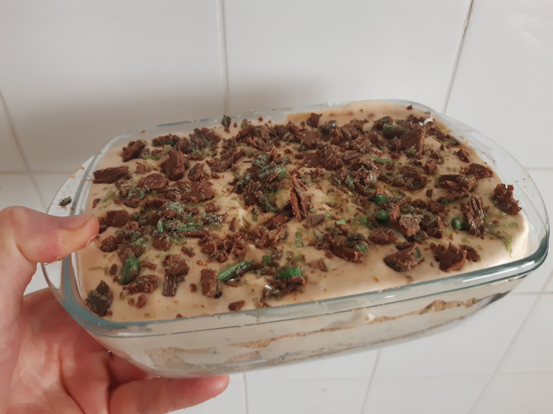 An important aspect of this dessert is that it is left in the fridge for approximately six hours to set. This allows the cookies to soften and become a well-incorporated part of the dessert, and the crispy peppermint pieces to infuse their flavours throughout. However, if you’re wanting your cookies to be crunchy, one hour will be enough for this delectable dessert.